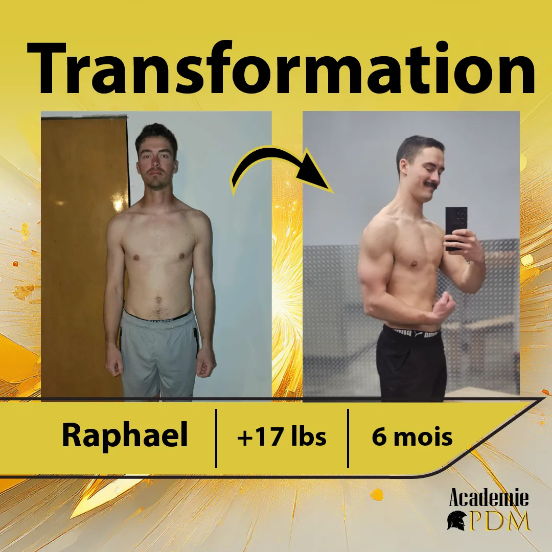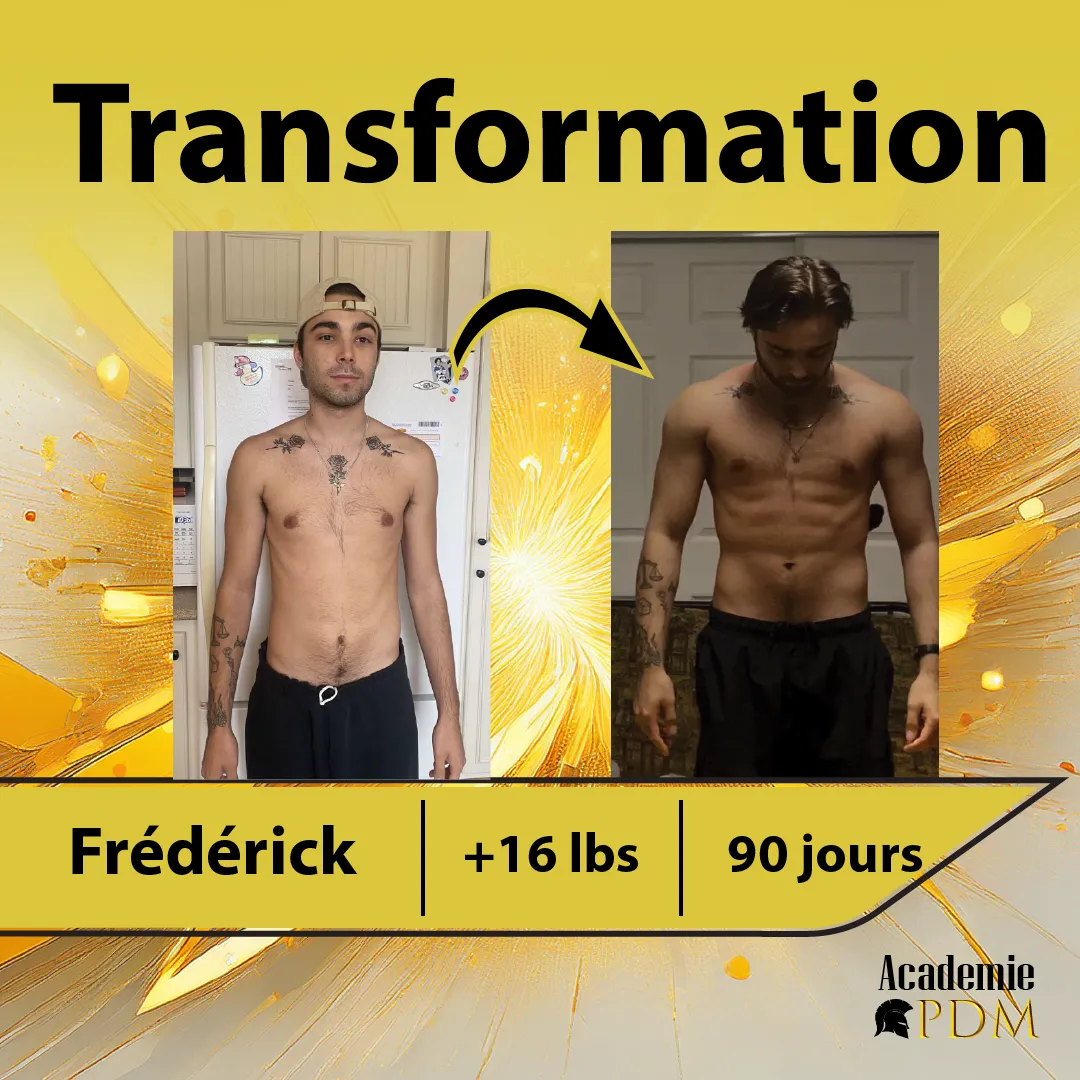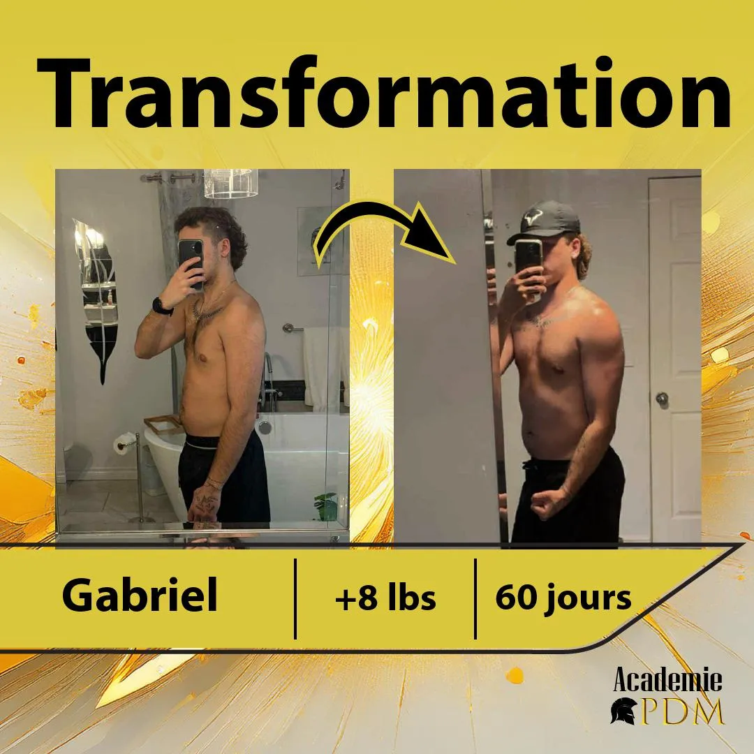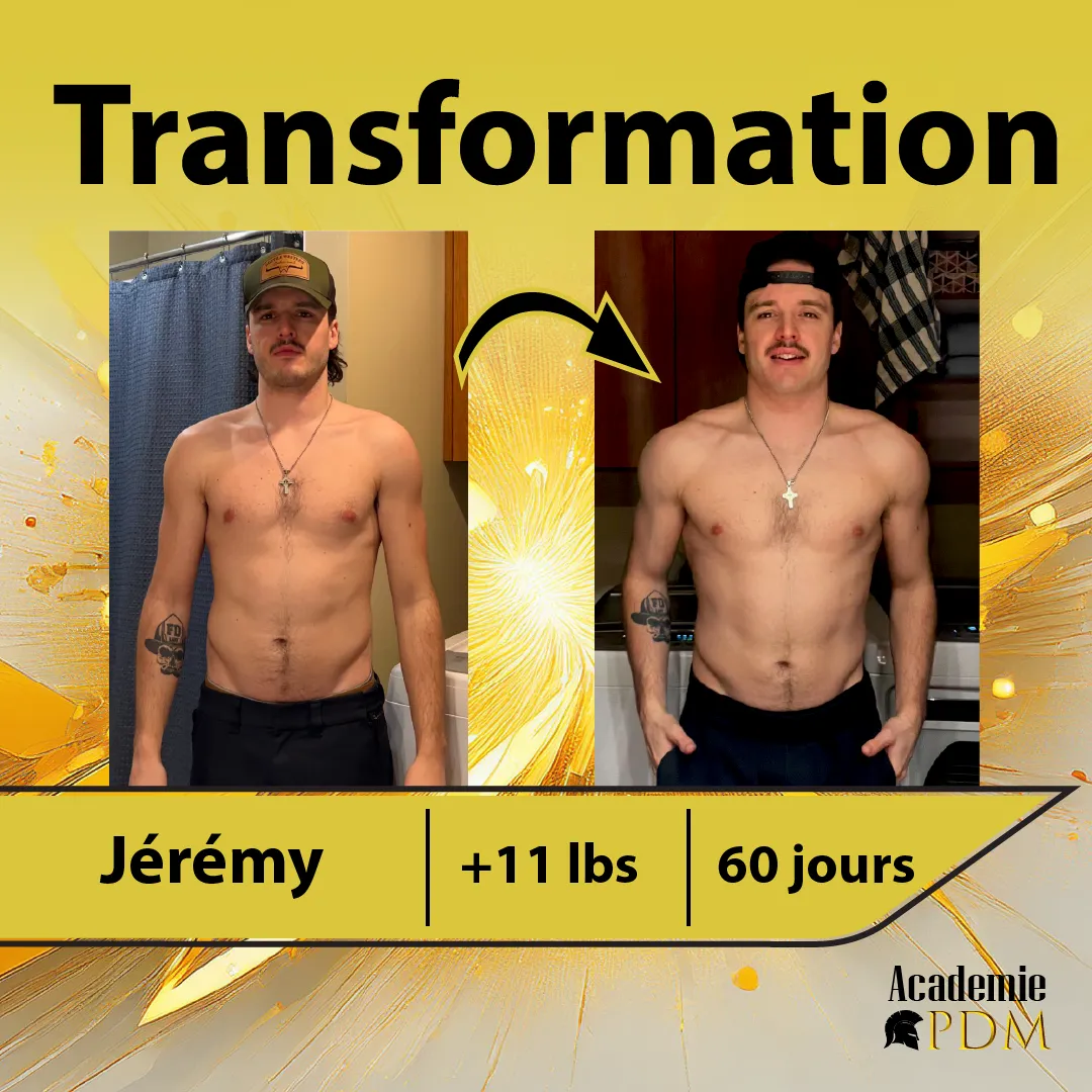 Bienvenue à l’Académie Prise de Masse, le programme de coaching en ligne dédié aux hommes qui ont un métabolisme rapide et qui peinent à prendre du poids. Si tu en as assez de rester maigre malgré tous tes efforts, que tu veux enfin bâtir un corps solide et en santé, cette méthode a été pensée pour toi. Guidé par Charles-Philippe Bergeron, qui est lui-même passé de 120 à 180 livres, tu seras accompagné pas à pas pour transformer ton physique et ta confiance.